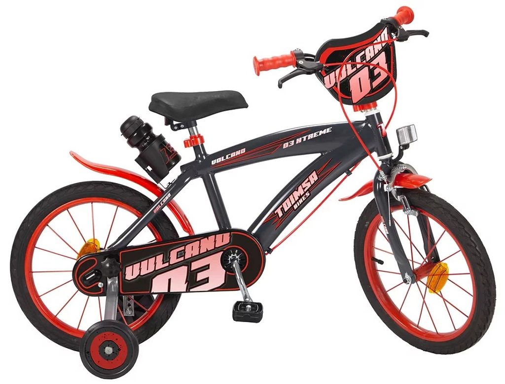 Originálny detský bicykel od španielskeho výrobcu Toimsa Vulcano s veľkosťou ráfikov 16 palcov je určený pre deti vo veku od 4 do 6 rokov s výškou do 105 cm. Bicykel je opatrený demontovateľnými balančnými kolieskami, dieťa sa teda bude cítiť hneď od prvej jazdy bezpečne a stabilne. Bicykel je vybavený 2 druhmi bŕzd. Brzdenie prebieha buď zadnou bubnovou brzdou alebo je možno použiť prednú pákovú brzdu. Obe brzdy sa ovládajú páčkami na riadidlách. Proti nechcenému namotaniu nohavice alebo šnúrky do reťaze má koleso kryt s farebnou potlačou, ktorý zakrýva celú reťaz. Sedadlo aj kormidlo sú výškovo nastaviteľné. V zadnej časti je pripevnený nosič s fľašou na pitie.