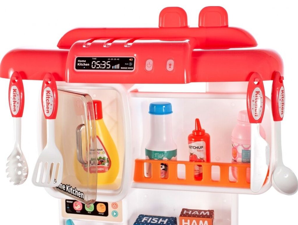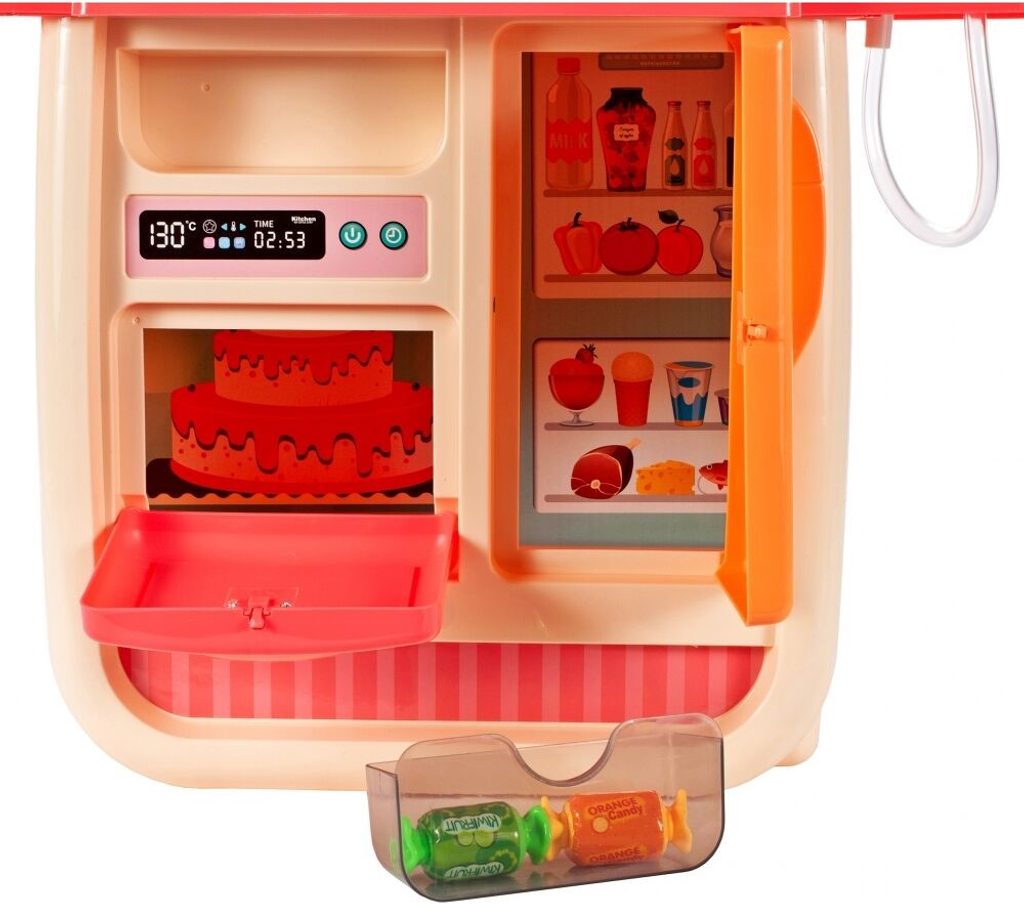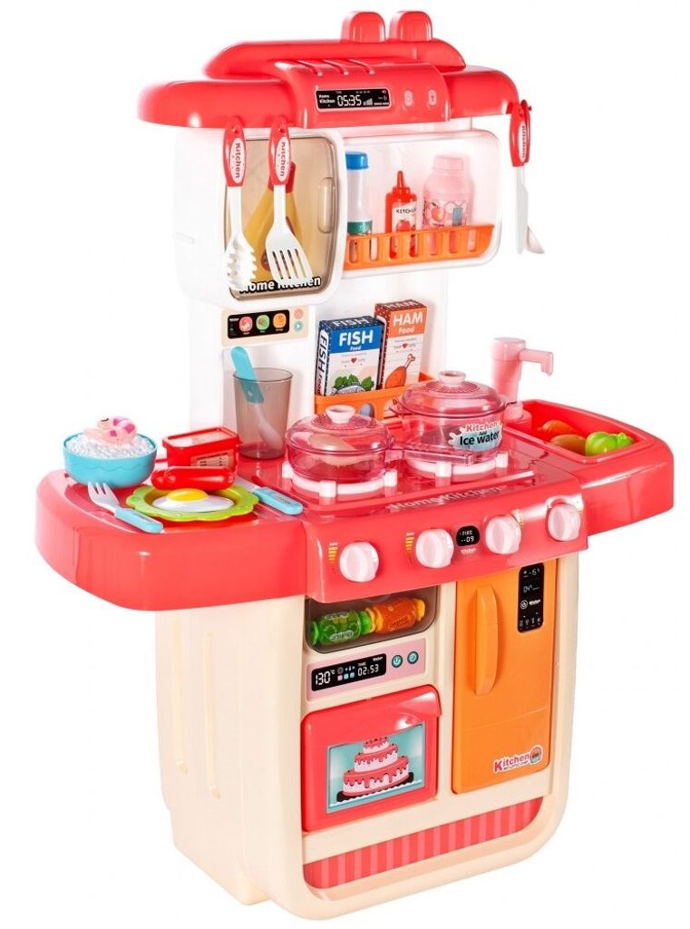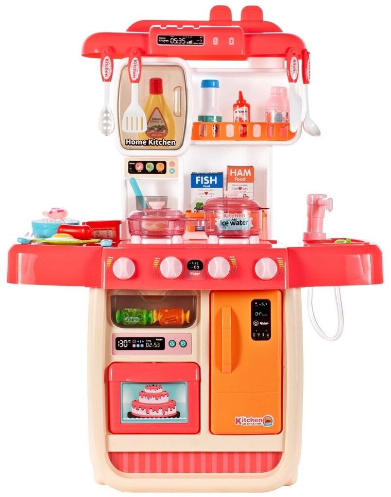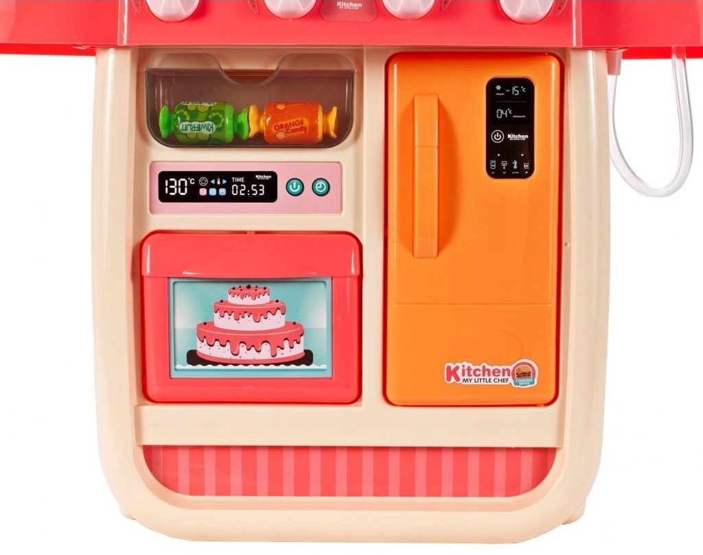 Interaktívna detská kuchynka pre najmenších so studenou parou a tečúcou vodou je určená pre deti od 36 mesiacov . Je vybavená príslušenstvom ako sú príbory, hrnce s pokrievkou, imitácia potravín a mnoho ďalších. Ľavý horák spôsobuje po naliatí malého množstva vody efekt studenej pary, takže varenie bude naozaj ako skutočné. Po naliatí vody do drezu a stlačení špeciálneho tlačidla začne tiecť voda a deti môžu umývať riad ako v reálnej kuchyni. Vaše dieťa sa určite s touto veľkou kuchynkou nudiť nebude. Vpredu je umiestnená otváracia chladnička a rúra. Je vyrobená z plastu v pestrofarebnom prevedení.