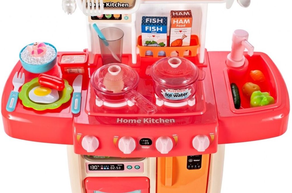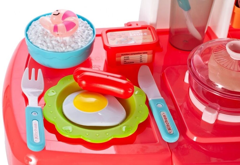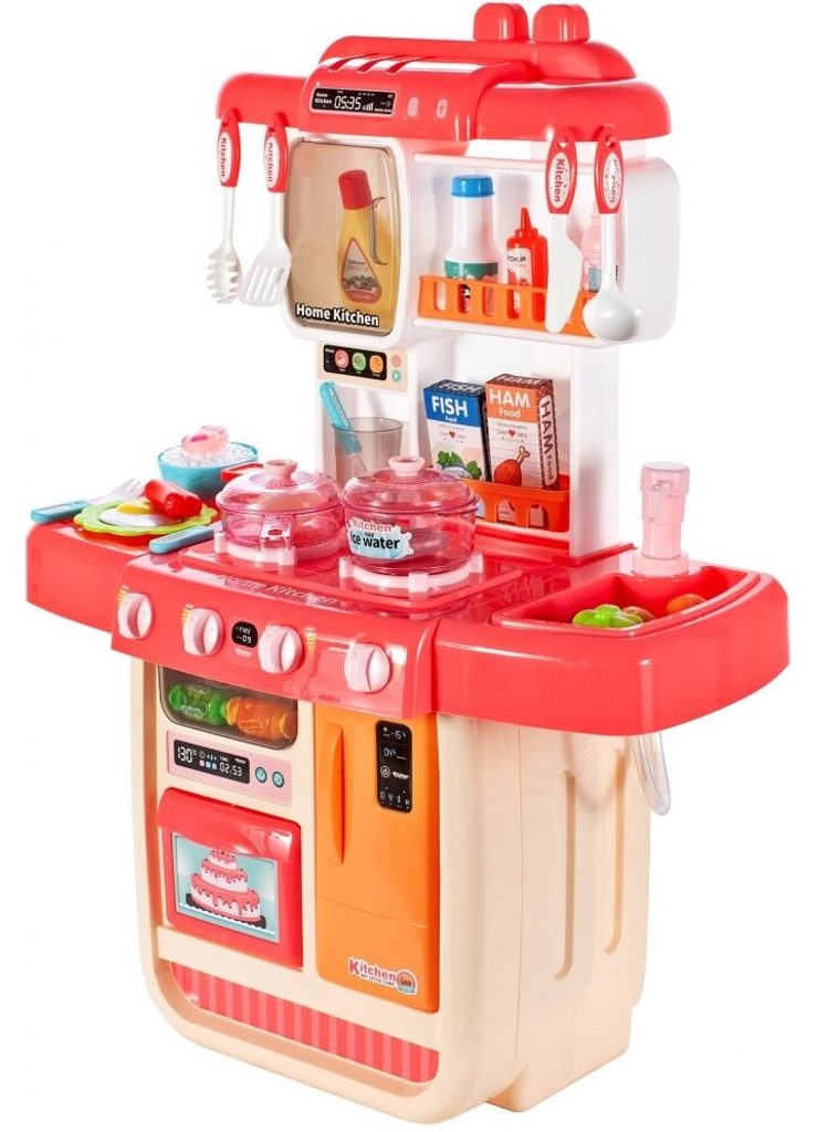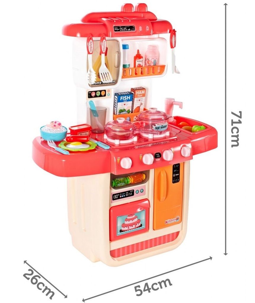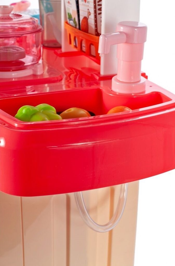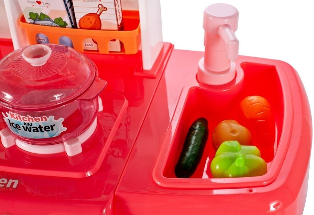 Interaktívna detská kuchynka pre najmenších so studenou parou a tečúcou vodou je určená pre deti od 36 mesiacov . Je vybavená príslušenstvom ako sú príbory, hrnce s pokrievkou, imitácia potravín a mnoho ďalších. Ľavý horák spôsobuje po naliatí malého množstva vody efekt studenej pary, takže varenie bude naozaj ako skutočné. Po naliatí vody do drezu a stlačení špeciálneho tlačidla začne tiecť voda a deti môžu umývať riad ako v reálnej kuchyni. Vaše dieťa sa určite s touto veľkou kuchynkou nudiť nebude. Vpredu je umiestnená otváracia chladnička a rúra. Je vyrobená z plastu v pestrofarebnom prevedení.