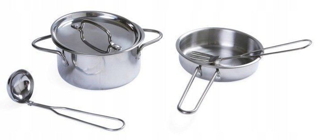 Súprava kovového riadu Ecotoys do detskej kuchynky imituje skutočný riad. Skladá sa celkom z 5 súčastí a nesmie chýbať v žiadnej detskej kuchynke, dá sa s ňou hrať aj samostatne. Nájdete tu hrniec, pokrievku, panvicu, naberačku a obracačku. Táto hračka je určená pre deti od 3 rokov .