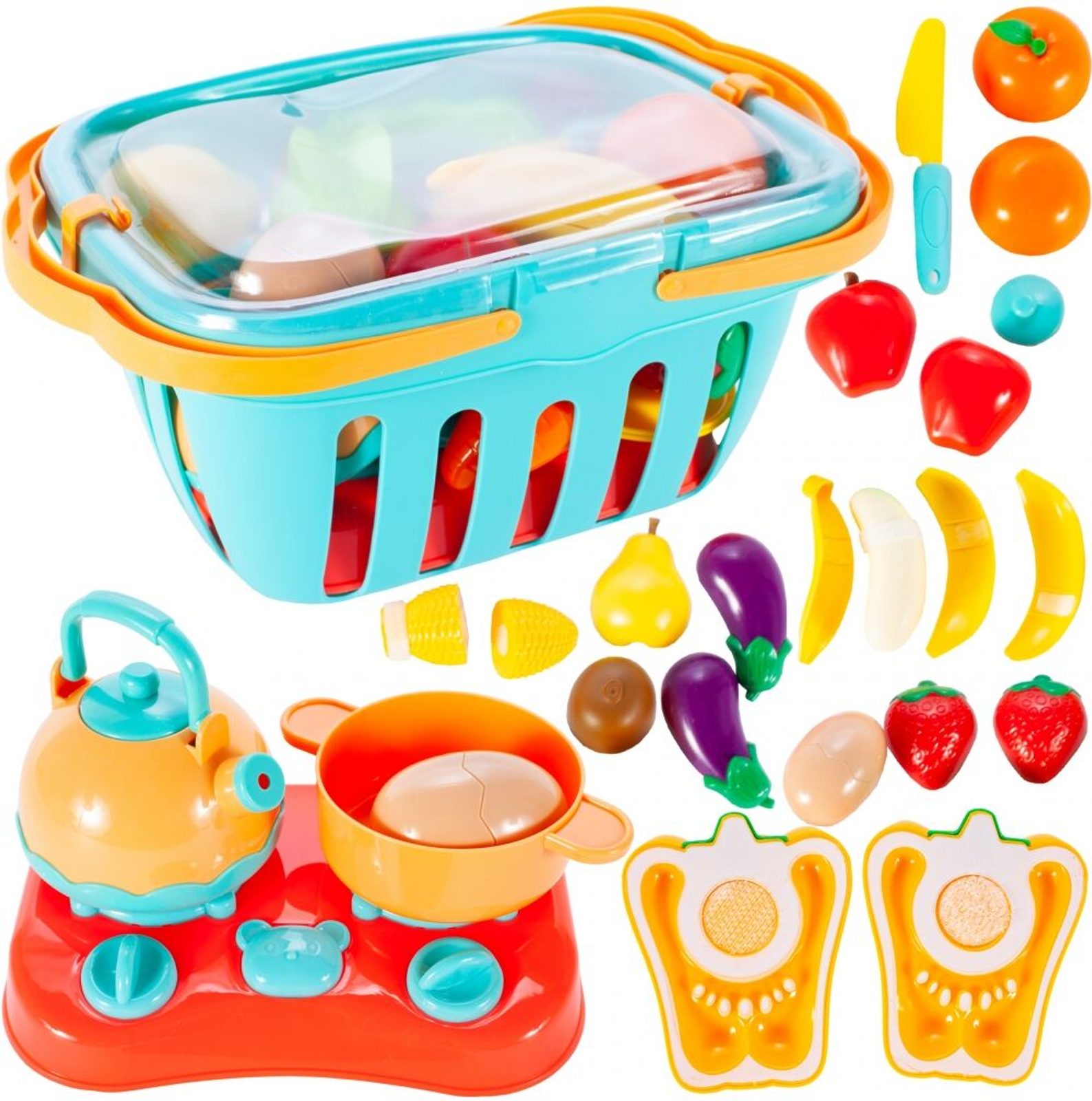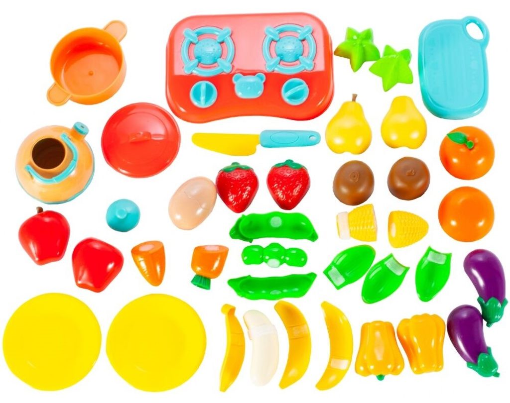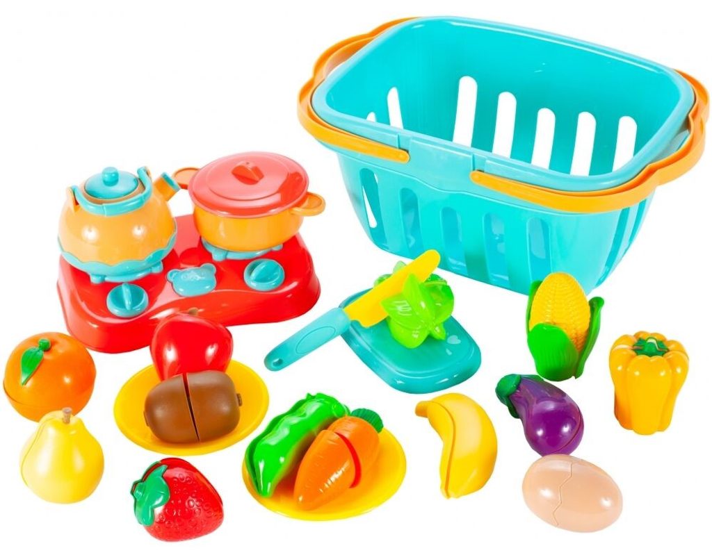 Súprava plastovej zeleniny a ovocia sa hodí do každej detskej kuchynky alebo sa s ňou môže dieťa hrať samostatne. Zeleninu je možné rozpoliť a zase späť spojiť. Balenie obsahuje najznámejšie druhy zeleniny, dieťa sa ich tak ľahko naučí rozpoznávať. Všetko je uložené v praktickom košíčku s priehľadom a úchytom, takže sa hodí ako ideálny darček. Súčasťou balenia je aj doštička, bezpečný nôž, kanvička, hrniec, varič a 2 tanieriky. Táto hračka je určená pre deti od 3 rokov .