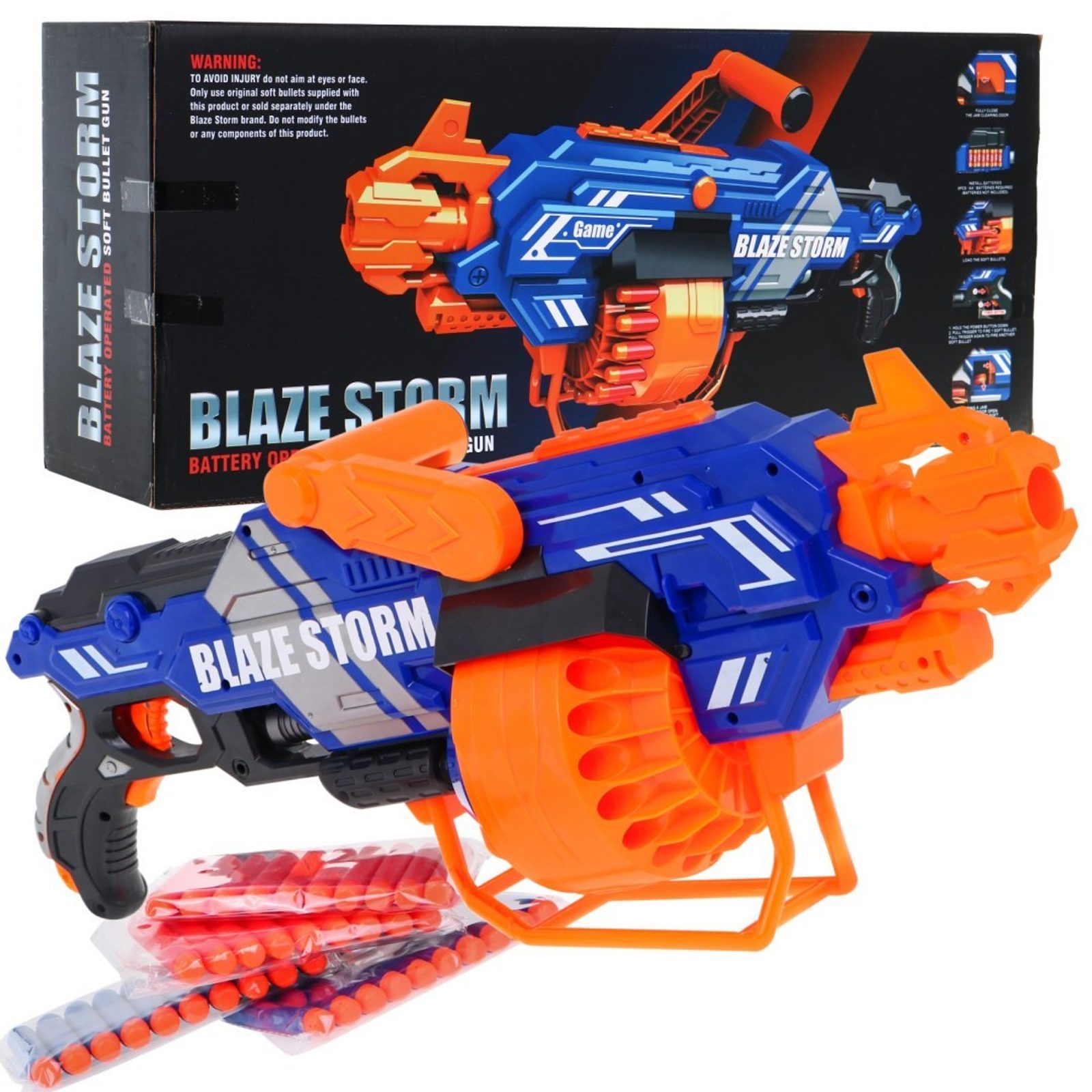 Rýchly a presný plne poloautomatický samopal pre deti je nabíjaný 20 penovými projektily. Projektily sú mäkké a tupé, nehrozí teda žiadne zranenie. Samopal má možnosť streľby jedného alebo série nábojov a strieľa až do vzdialenosti 10 m. V hornej časti je umiestnený úchyt, v spodnej podstavec. V zostave je aj 20 modrých a 20 červených nábojov. Samopal od značky Blaze Storm je príručný, ľahký a odolný. Jedná sa o skvelú zábavu pre chlapcov a môžete nám veriť, že k hre s týmto samopalom sa radi zapoja aj oteckovia.
