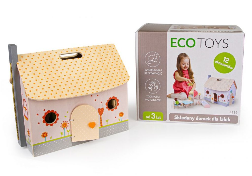 Drevený rozkladací domček Ecotoys Little Dollhouse má celkom 4 miestnosti umiestnené v dvoch poschodiach. Obsahuje celkom 9 kusov dreveného nábytku ako sú stoličky so stolom, lampa, pohovka, posteľ, kuchynka a ďalšie. Súčasťou domčeka sú tiež 2 postavičky. Vďaka malým rozmerom a možnosti uzavretia je domček ideálnou hračkou, ktorú si môže dieťa vziať sebou na návštevu alebo kamkoľvek bude chcieť. Hračka je určená pre deti od 3 rokov veku.