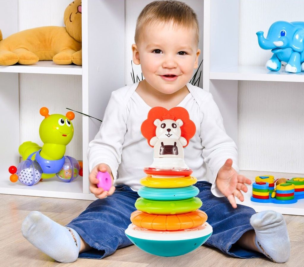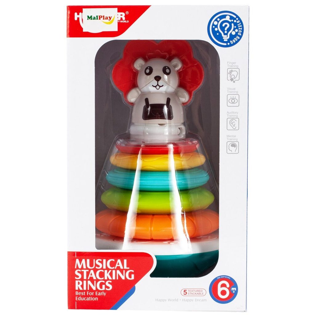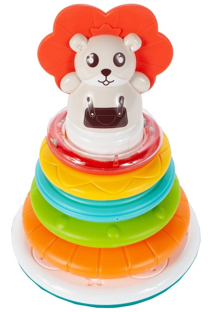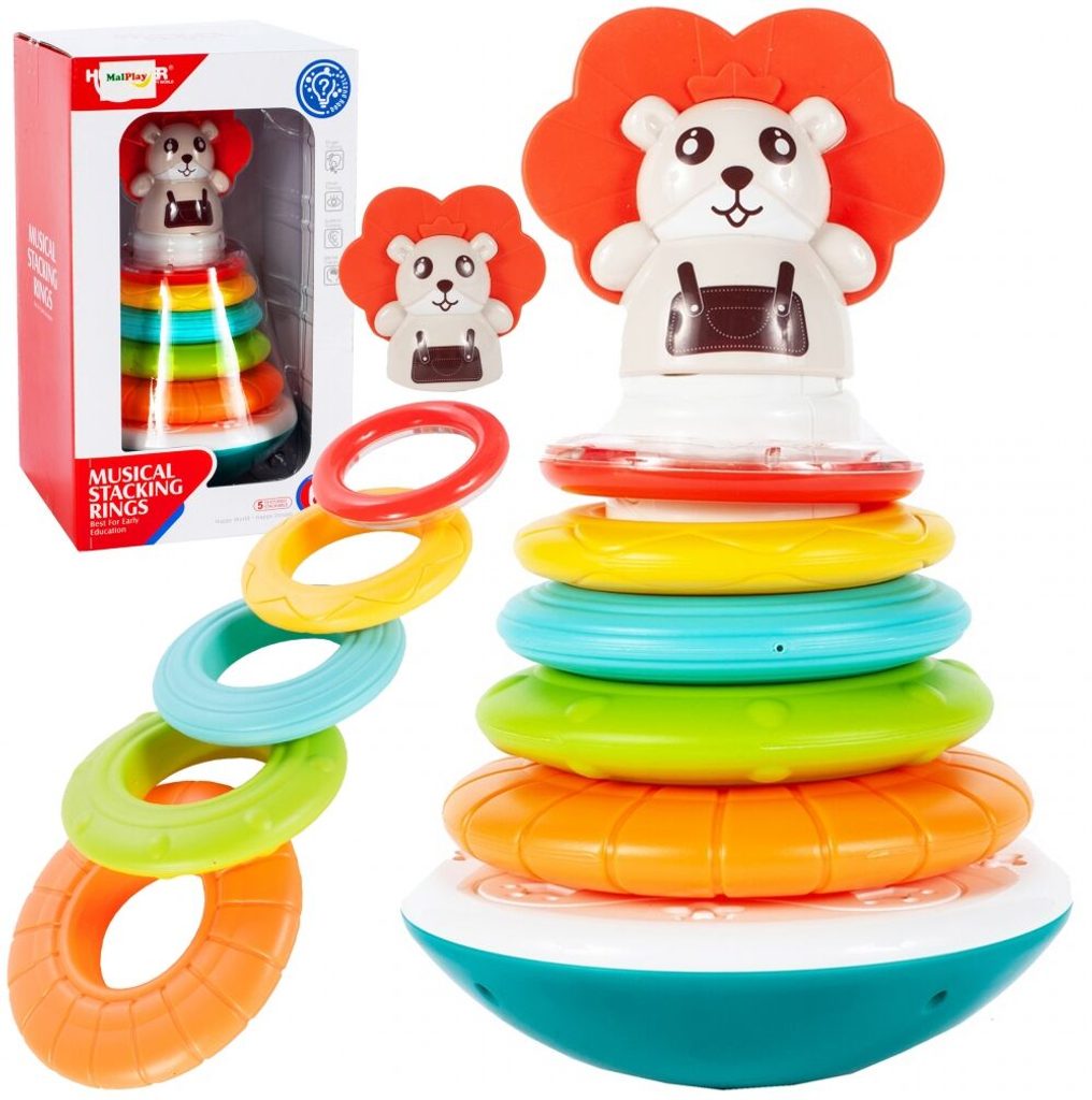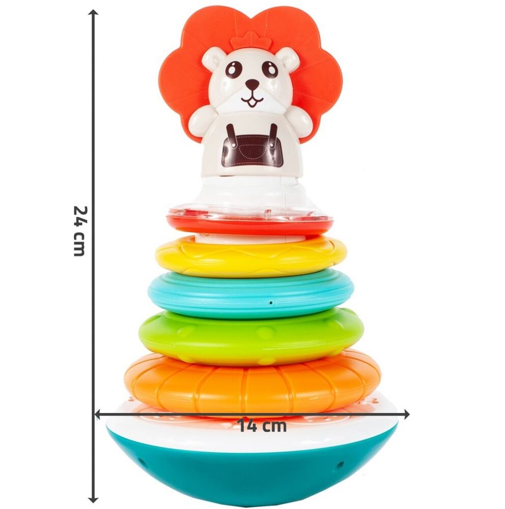 Interaktívna detská pyramída Levíček so zvukmi je určená pre deti od 6 mesiacov. Veľa farieb a tvarov stimuluje zrakové podnety u dieťaťa, správne rozvíja kognitívnu motoriku. Pri nasadzovaní obruče vychádzajú z hračky rôzne zvuky a po stlačení tlačidla sa ozývajú krátke melódie a zvuky zvieratiek. Vďaka takej zábave si batoľa trénuje manuálnu zručnosť, logické myslenie alebo rozlišovanie farieb. Skvelá hračka, ktorá "rastie" s Vaším dieťaťom.